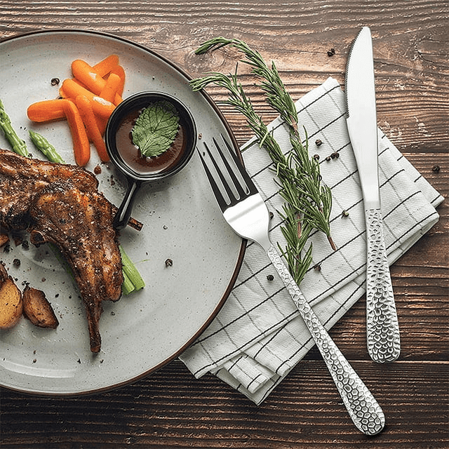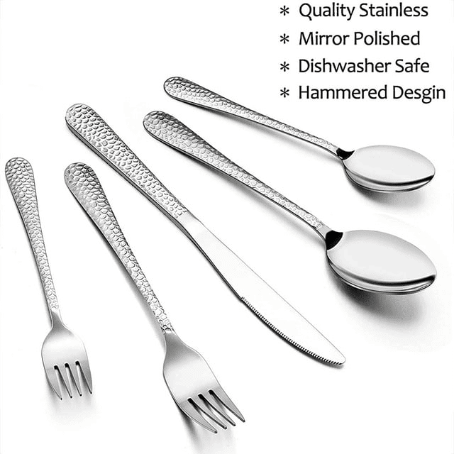 Modern style - unique hammered design on each handle that complements most any decor, mirror finish always keep shiny, stylish and practical flatware elevates your fine dining experience