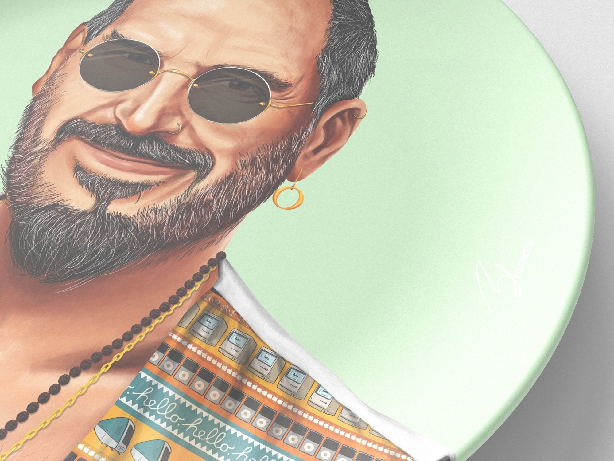 "Your work is going to fill a large part of your life, and the only way to be truly satisfied is to do what you believe is great work. And the only way to do great work is to love what you do."Steve JobsThis unique 10" DecoWare® plate offers a playful tribute to Steve Jobs, with a stylized depiction that includes hipster elements and an innovative flair. It's a piece that tech enthusiasts and collectors alike would appreciate for its blend of iconic inspiration and artistic reimagination. P R O D U C T D E T A I L S // 10" Round Dinner Plate, 0.75" Tall// Microwave safe// Oven-safe up to 250 degrees Fahrenheit for 1 hour// Dishwasher-safe// Molded from DecoWare® - a high performance medical-grade polymer// Safe for food contact// Contains no melamine, BPA's, formaldehyde or other harmful chemicals// Recyclable// 100% Made in the U.S.A.// Durable satin finish// Unbreakable with normal use  F I N E P R I N T Due to the many variations in monitors, the actual colors on each plate and platter may appear slightly different than the colors that appear on your monitor. They are awesome in real life!Each unique Plate is made to order. S H I P P I N G T I M E S Please allow 5-7 business days for your package to arrive via USPS. If your order has not arrived by the 7th business day, please contact us so we can resolve the issue. Most orders arrive to our customers within 3-7 days of placing the order, but we are unable to guarantee this fast delivery due to production and shipping times that are outside of our control. R E T U R N S & R E F U N D S Returns and exchanges are accepted within 14 days of delivery. If there are any problems with your order, please feel free to message me and I will help any way possible. W E L O V E O U R C U S T O M E R S Thank you so much for browsing our listings, don't hesitate to message with any questions or concerns. We strive to please you!