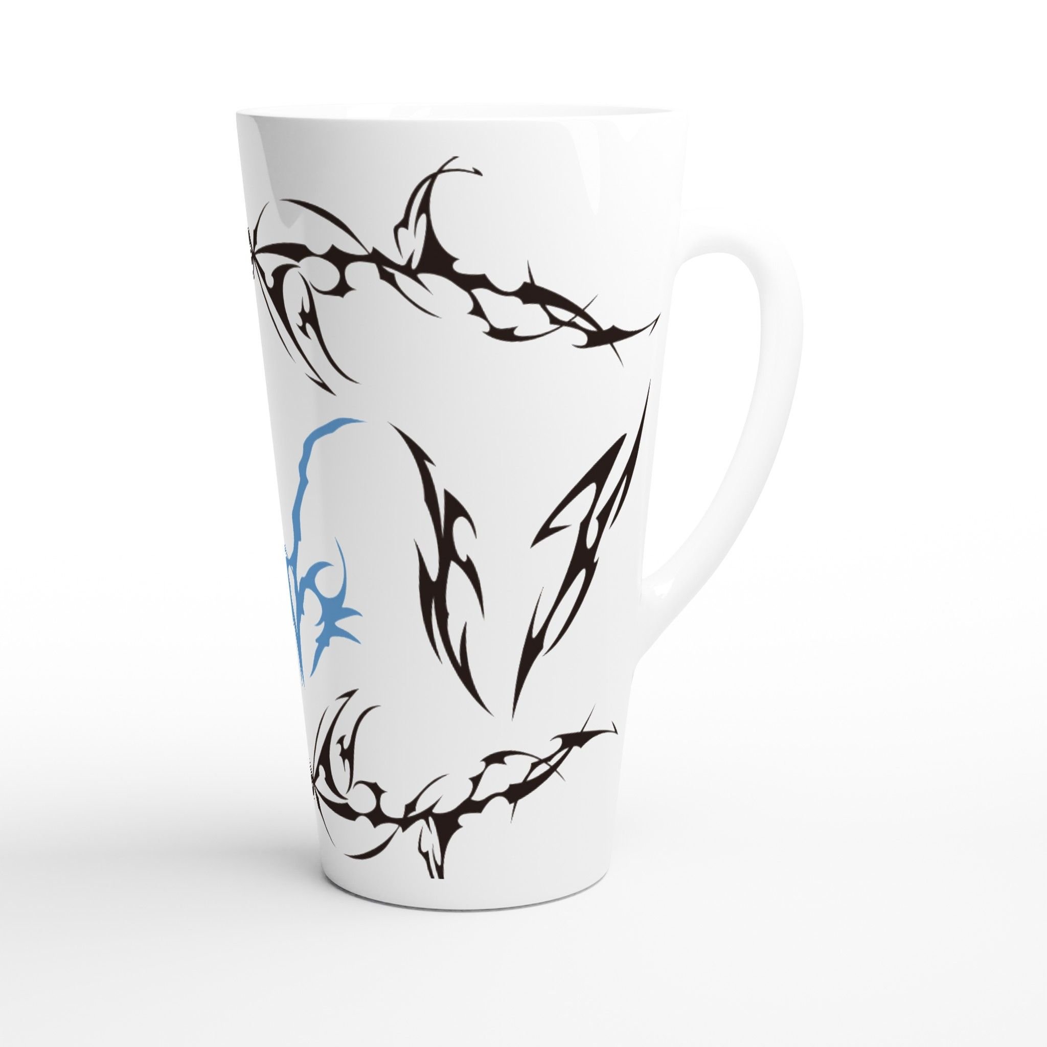 Material: High-quality ceramic coffee mugsCapacity: 17 ozColor: Glossy white coffee mugsHandle: C-shaped handle for comfortable gripDishwasher and Microwave Safe: Yes, for added convenienceDesign: Tribal pattern in black and blue unique coffee mugs